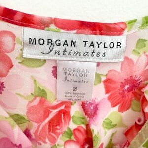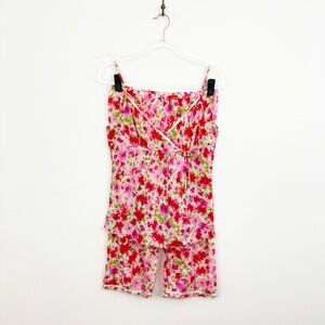 DESCRIPTION: Morgan Taylor Intimates Pink Floral Capri Pajama Set. Vintage Y2K pajama set. Featuring a soft, lightweight fabric with an allover red, pink, and green floral print, this set includes a sleeveless cami top with adjustable straps and matching cropped pants. Perfect for lounging or bedtime in comfort and style.