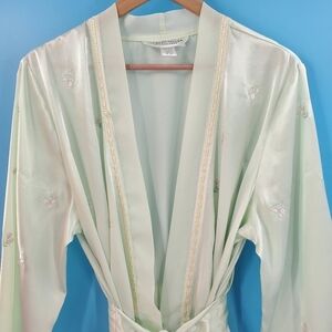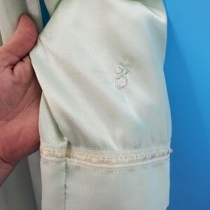 Morgan Taylor Intimates light green satin robe, built in tie, pink rosebud embroidery, ribbon trim at cuffs and neckline, very gently used condition no issues, size XL measurements are listed in photos