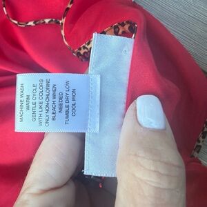 Features a rich red body with leopard print trim along the neckline, straps, and hemline. Flattering V-neck with a small bow detail and adjustable spaghetti straps.