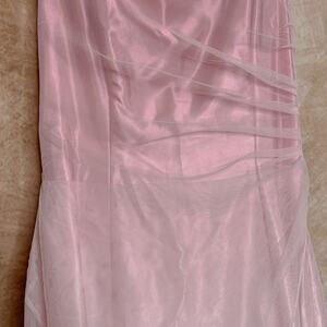 Ombre satin pink fabric with mesh layered bodice, and flower embroidered on lower half. Zipper closure in back. Structured boning in bodice.