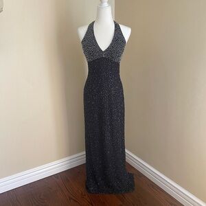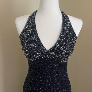 Morgan and Co. by Linda Bernell dark blue/silver beaded full length back halter evening gown. Fully lined. 100% polyester. 53” long and 17” pit to pit. Zipper on the back. Slit on back. Dress has a couple of loose threads and missing a couple of beads-see pics. Other than that dress is in excellent condition. Offers welcome.