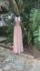 This pretty gown is a stretch polyester fabric. The bodice is sequined. It is a halter look top that ties in the back but actually has a full back with a cut out. Skirt is gathered and full length in excellent condition new with tags