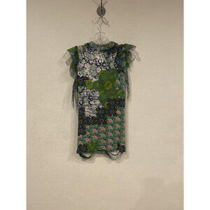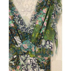 Morgan de Toi Top Womens Small Green Blue Floral Ruched Mesh V Neck Ruffles