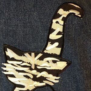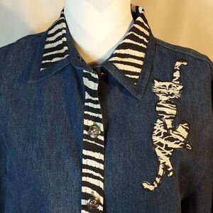This blue denim with black and white zebra print trim, long sleeve, button down Morgan Cole "Cat" women's shirt is a size XL with a pit to pit measuring 23-1/2". Zebra print trim with silvertone buttons. 55% ramie 45% cotton and hand washable. Pre-owned and in excellent condition. All offers are welcome.