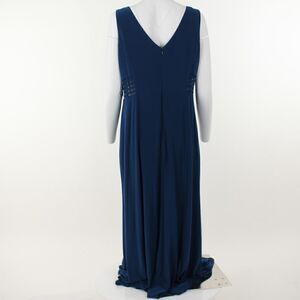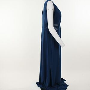 Morgan & Company designs a dramatic plus size gown with a slit up the side all the way to the thigh. The deep V-neckline at the front is really a sheer panel of illusion mesh.