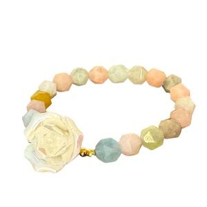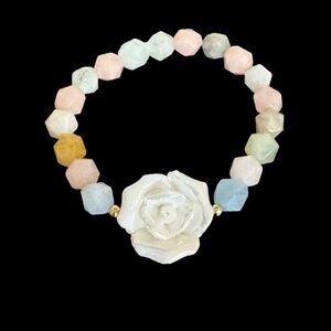 Check out this pretty stretch bracelet with pastel morganite faceted beads that surround a shimmering white resin rose set off by gold filled spacers. This is a perfect bracelet to wear for spring and summer and would make a great Mother’s Day gift. Same or Next day shipping and beautifully packaged in a gift box for giving or storing.
