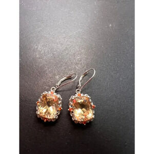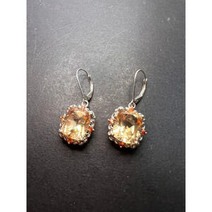 Big peachy stones test as quartz. These are a lab created quartz that mimics morganite. Orange stones test as spinel and also most likely lab created. Set in either white gold , platinum or rhodium plated over sterling silver. Lever backs. 925 STS