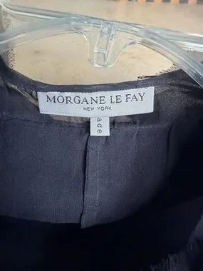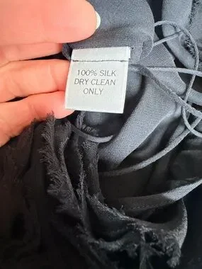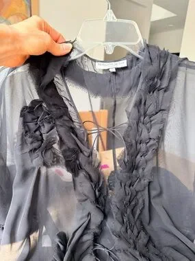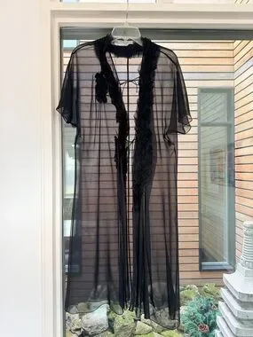 Sheer black robe-style cover with a tie front. Short sleeve silhouette with ruffled trim. Lightweight layering piece for styling over outfits. Feminine and pretty. No flaws. Smoke free home. Approximately 42” long and 21” underarm to underarm.