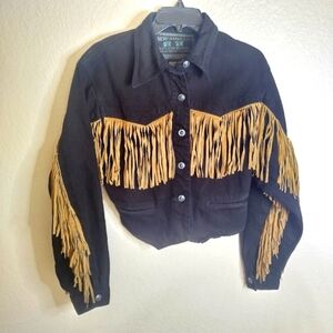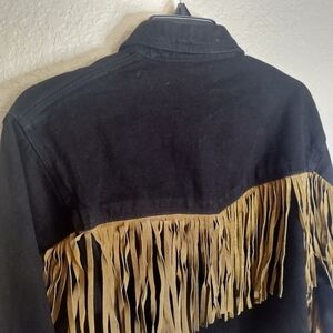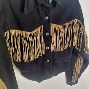 Morganwear Black Denim Western Fringe Festive Turquoise Buttoned Jacket Sz M
