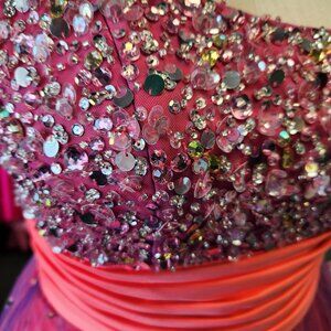Beaded modified sweetheart neckline bodice , cumber bun sash waist, Pink and purple layered tulle skirt with scattered bead work. Gown will zip, just too small for my mannequin.