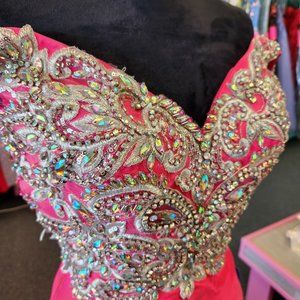 Off the shoulder, AB crystal beaded silver stitched lace bodice with bra back closure and chiffon flowy skirt! The back of the dress will close, it is just too small for my mannequin. Pink Size 0 In good condition, has only been shop worn by our customers searching for the perfect dress! Please also check out our sister closet Cupid's Corner Inc All Sales Final No Refunds or Returns