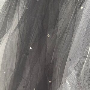 This elegant dress features a stunning black and white design, perfect for special occasions. The intricate detailing adds a touch of sophistication. You will be sure to WOW! Sooo many layers of beautiful white and black tool covered in shimmering sequins! There is a bit of make up on the inside near the bust. See pictures- not visible when worn! Size 9/10 original price $695