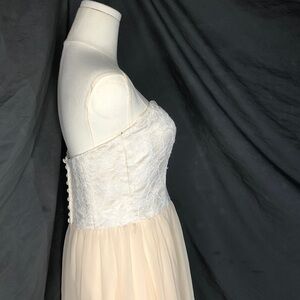 Chic strapless gown with lace bodice. Flowing chiffon skirt. Ideal for formal events. Zipper stops one inch below back. Needs a clasp replacement on top of the zipper. Bottom of zipper needs to be hand stitched into the seam. (See pictures)