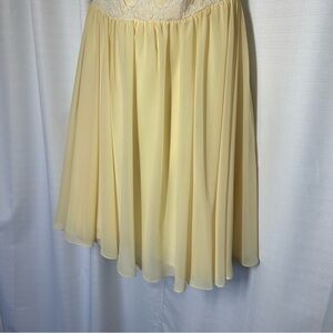 Boning on bodice for structure. Chiffon, flowy skirt. Fit and flare style. Light buttercream yellow color. Fabric has NO STRETCH