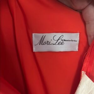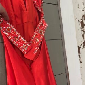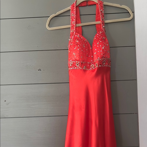 This dress will need to be dry cleaned just at the bottom where it touched the ground. This exquisite red gown by Mori Lee is adorned with shimmering sequins and intricate embellishments, perfect for a glamorous prom night. The sleeveless design features a halter neckline, adding a touch of elegance to the form-fitting bodice. Flowing into a smooth, silky skirt, this dress ensures both style and comfort for your special occasion.
