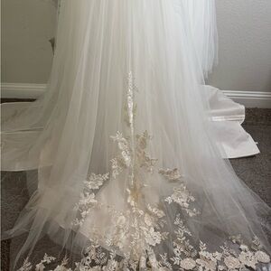 Strapless white dress with floral lace details. Flowing tulle skirt. Ideal for elegant occasions.