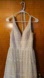 The Mori Lee wedding Dress is a stunning choice for any wedding occasion. This dress features a plunging neckline and a fitted bodice that gracefully transitions into a flowing A-line skirt. Crafted with delicate lace or embroidered patterns, it exudes a romantic and elegant charm, perfect for brides or wedding guests. 14.5 inches pit to pit 13.5 inches across waist size 5/5