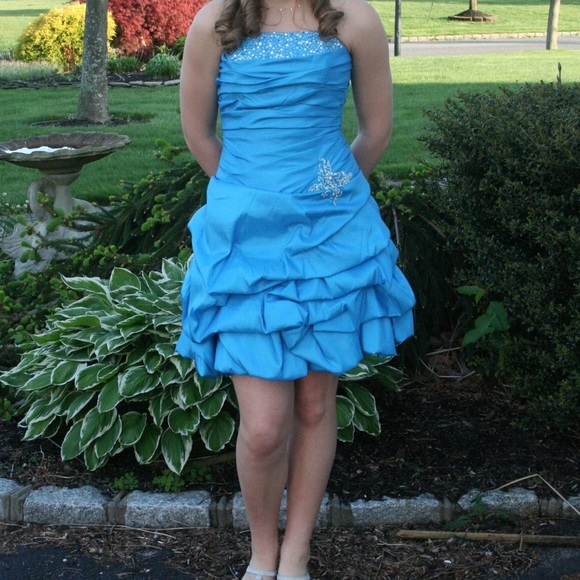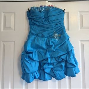 Taffeta dress with fitted bodice and drop waist ruffle skirt. Beading along the neckline and hip accent, corset back. Gives beautiful shape! Worn twice.
