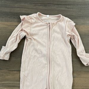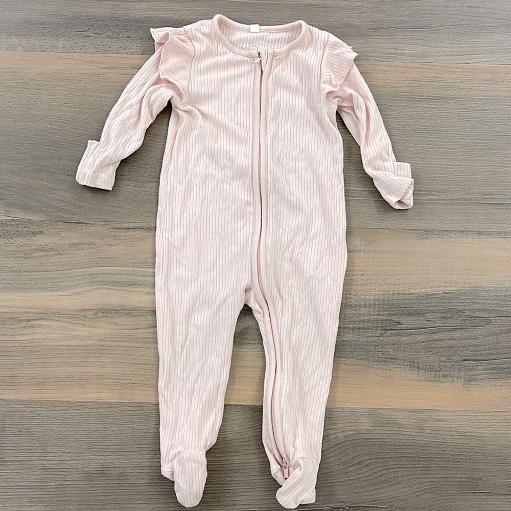 The softest pajama brand, Mori footie dual zip pajamas with fun shoulder ruffle. 6-9m in a nice light pink. Light wear throughout. Pet and smoke free home, reach out with any questions