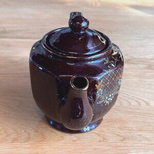 Moriage Style Ceramic Redware Teapot, Brown Flora, Vintage Pre-War Japan