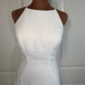This is a form-fitting crepe dress with a high halter neckline and an exposed back featuring crisscross straps and a keyhole cutout. Semi-Chapel train, covered back buttons. A blend of sultry and sophisticated.