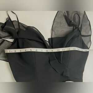 In good used condition Morilee Madeline Gardner black chiffon dress. Dress is fully lined, spaghetti straps, and ruffles on the neckline. Please look at photos for measurements and look at hem on last photo.
