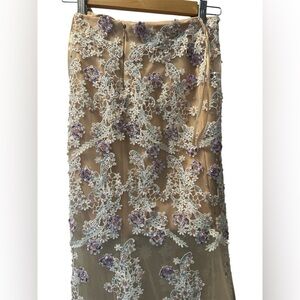 Excellent Condition ~ Beautifully Elegant Lace and Sequin detailed Long Maxi Skirt in Size 2. Beautiful sheer tulle shirt with all the colors and beaded accents make this piece a must have!