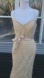 Style-Spaghetti strap lace covered wedding formal dress. Torso boning; lightly padded cups; back zipper; deco buttons; short train