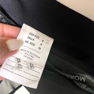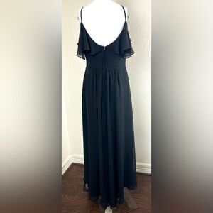 In good used condition Morilee Madeline Gardner black chiffon dress. Dress is fully lined, spaghetti straps, and ruffles on the neckline. Please look at photos for measurements and look at hem on last photo.