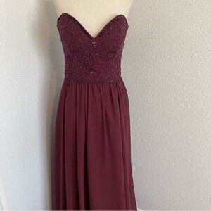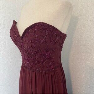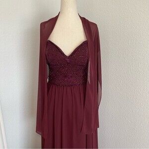 Stunning bordeaux (purple plum) color strapless gown. Beaded top and flowy, fully lined skirt. Matching wrap. Floor length. Beautifully made and an elegant style for your next special event. Perfect for: black tie, formal, evening, cocktail, prom, ball, wedding guest, bridesmaid, gala, school dance.