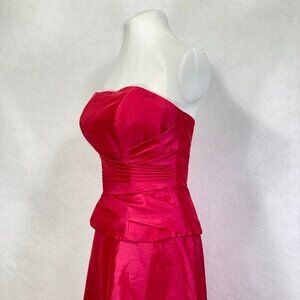 Top is sleeveless with with gathered pleats in the middle, hidden back zip with a hook eye closure.