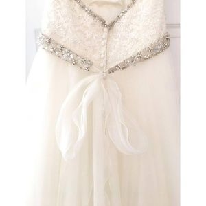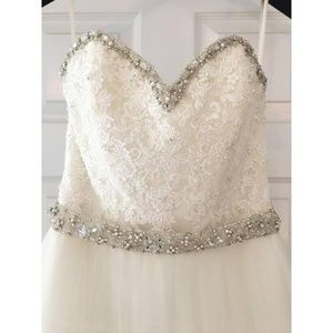 Brand new, never been worn Morilee wedding dress by Madeline Gardner (retail price $1,300.00). Sweetheart, strapless neckline with beautiful beading. Lace bodice with beautiful beaded tie belt. Button back design. Floor length tulle skirt followed by an elegant train.