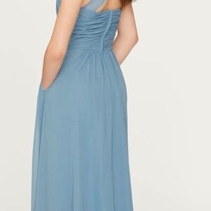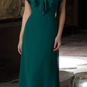 Chiffon junior bridesmaid dress has an asymetrically draped bodice with a high neckline. New with tags. Unaltered. Emerald green color as show in last photo.