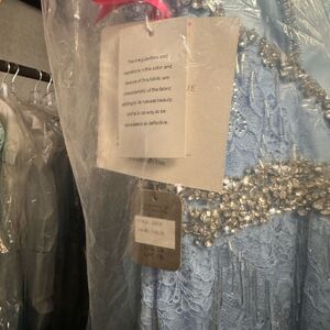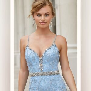 All Over Lace Column Dress Featuring Art Deco Inspired Fringe Details. A Beaded Waistline and Straps Completes the Look. Colors Available: Light Blue, Champagne