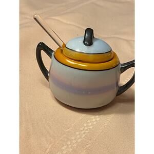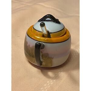 Morimura Porcelain Sugar Bowl, Lid & Glass Spoon Scenic design 2.75 in tall EUC