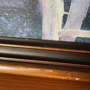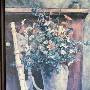 This 1987 painting by artist Patton Wilson is a still life of a flower arrangement on a chair. This is a very large framed print, and will look lovely in any room in your home or office! There are a few flaws in the frame, and a couple of small discolorations, which are shown in photos. Overall great preloved condition, and would make a great gift this holiday season!