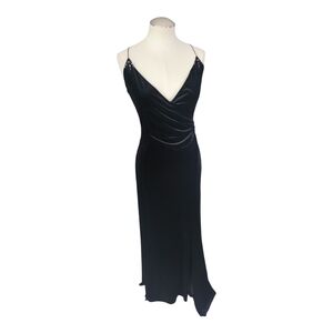 Elegant and timeless, this Morning Lady evening gown in size 6 is designed in luxurious black velvet with a flattering draped cowl neckline and delicate spaghetti straps. Features a side zipper closure for a sleek fit and a side slit for ease of movement.