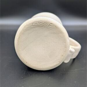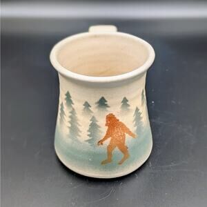Handmade Landsoe Mug: Signed Landsoe, stoneware, 4.25" tall x 3.5" across rim, handmade with glazed pine tree and Bigfoot design.