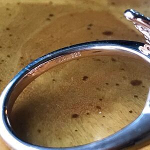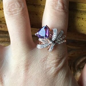 This stunning women's ring features a natural amethyst mined from Morocco. The ring also has natural white zircons. The ring is set in solid .925 sterling silver with an 18k rose gold vermeil. This ring is very unique, sporting a sparkling bow design. The ring in the photos is the one you will receive, so please see photos for gemstone quality and measurements. Size 10.