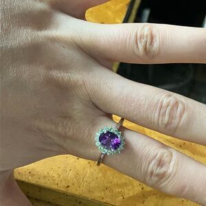 This stunning halo ring features a natural amethyst mined from Morocco. The stone measures about 9x7 mm. The ring also has natural tsavorite garnet accents. All of the gemstones on this piece are earth mined and not enhanced in any way. The ring is set in solid .925 sterling silver with a platinum finish. The ring in the photos is the one you will receive, so please see photos for gemstone quality and measurements. Size 10.