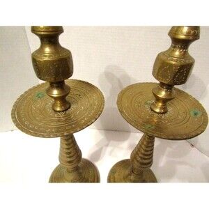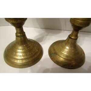 Description: Vintage 1950s Moroccan Candle Holders Solid Brass Mid Century Set Pair Handcrafted Etched