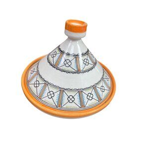This Moroccan Fes tagine is crafted with intricate hand-painted patterns and a vibrant orange rim. Ideal for slow cooking and serving traditional dishes. Its beautiful and no defects. Its about 8" tall and 9.5" wide .