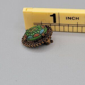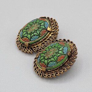 Moroccan Matrix Domed Clip On Earrings Molded Enamel Filigree Frame Vintage