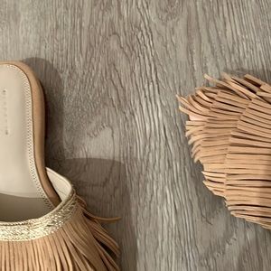 Super comfortable mules. Handmade in morocco. Brand new. All leather bottoms. Suede fringe top with beautiful gold damask trim detail. When the fringe moves around, you can see the pink leather peaking out underneath. Color is a beautiful, rich, tan suede and the gold glistens. The inner part of the shoe is also leather beautifully detailed.This style is no longer made and is quite collectable! Hand-carried from Morocco!