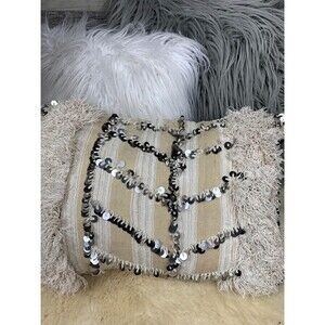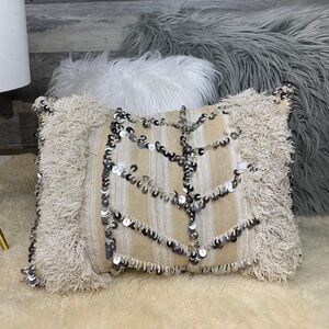 Made from natural sheep’s wool, cotton, and linen, the fabric has been carefully upcycled into an easy-to-fill cushion cover, embellished with traditional white threads and shimmering metal sequins that are iconic to Handira throws.