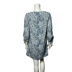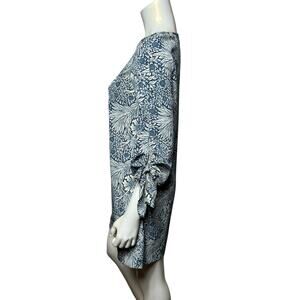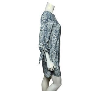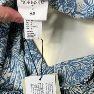 Stunning collaboration piece from Morris & Co x H&M featuring a classic William Morris-inspired floral print in blue and white. This shift dress showcases an intricate botanical pattern with sweeping ferns, blooms, and foliage throughout. The elegant 3/4 length sleeves feature adjustable tie details at the cuffs, creating a feminine bow-like effect. The dress has a relaxed shift silhouette with a boat neckline and falls to a flattering above-knee length. Made from a lightweight fabric perfect for year-round wear.