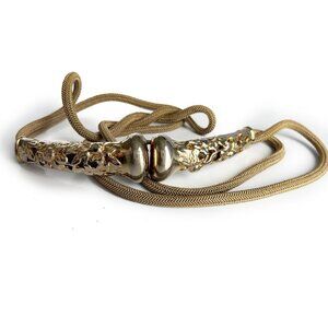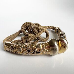 Stamped MM for Morris Moskowitz on the buckle pieces. Approximate measurements of both buckle pieces = 8in L x 1.25in at the highest. Cord length, doubled and measured end to end = 26in.