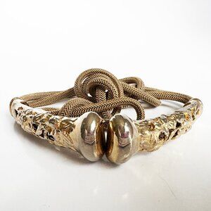 Preowned, vintage Morris Moskowitz belt, likely made in the late 70s or early 80s. The buckle is made from gold metal and features art nouveau style florals. The belt is made from double strands of tan cord.