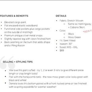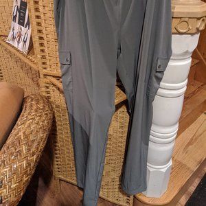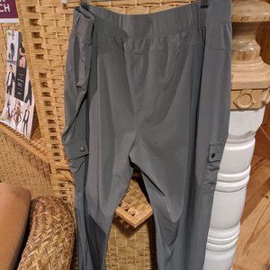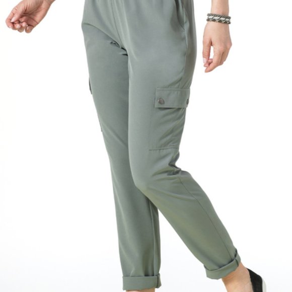 Elevated cargo pant, Flat encased elastic waistband, Functional side pockets plus cargo pockets on the outside of mid thigh, Premium antique silver metal snaps, slightly tapered leg with clean finished hem, Back seaming on the bum that adds shape and a lifting illusion. Fabric: Stretch Woven, Fit: Semi-Fitted, Inseam: 30"