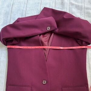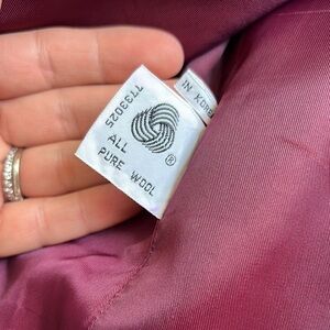 Mort Schrader’s 60s Dark Wine-Colored Blazer in Size 10. Please review the measurements carefully, as this is a vintage piece. It would fit a medium best. The photos don’t fully capture the stunning dark wine color with its deep purple hues. It has a one-button closure, is lined, and features functional pockets. It’s an incredible vintage piece that can easily be styled with modern items. It hits at the waist.